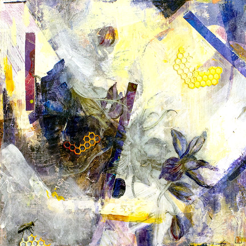 Collage and transfer with acrylic on 12 x 12 inch panel.