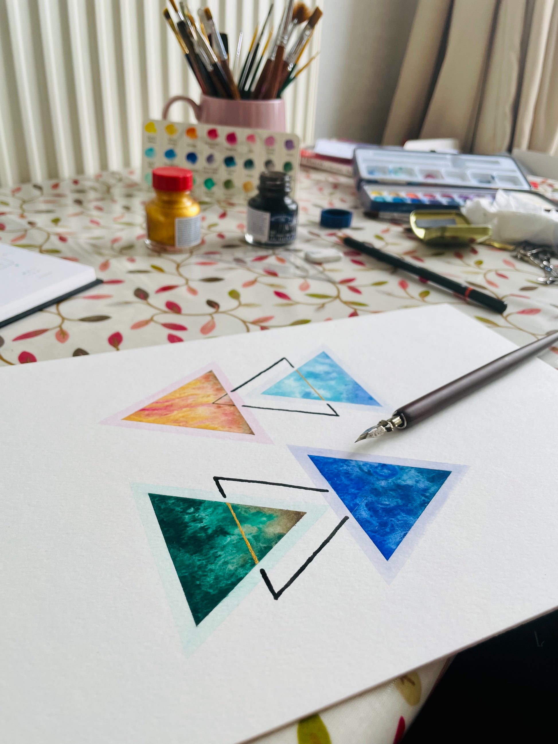 No known animal derivatives in the original art's paper, watercolours, ink, brushes, tape, fixative used (checks made at source where possible); vegan.