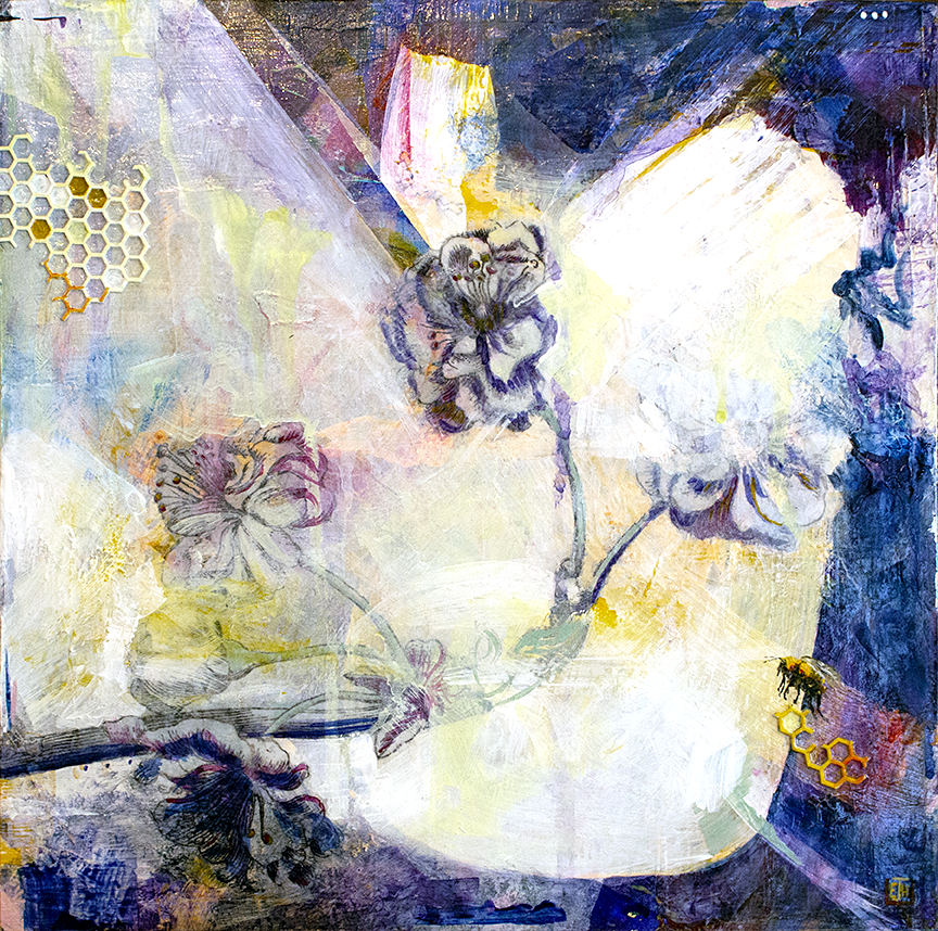Collage and transfer with acrylic on 12 x 12 inch panel.